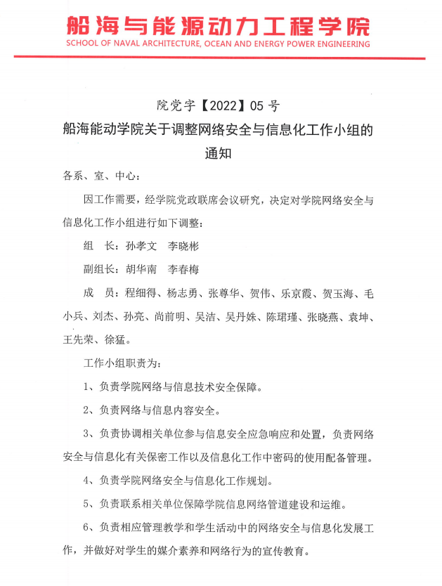 船海能動學院關于調整網絡安全與信息化工作小組的通知