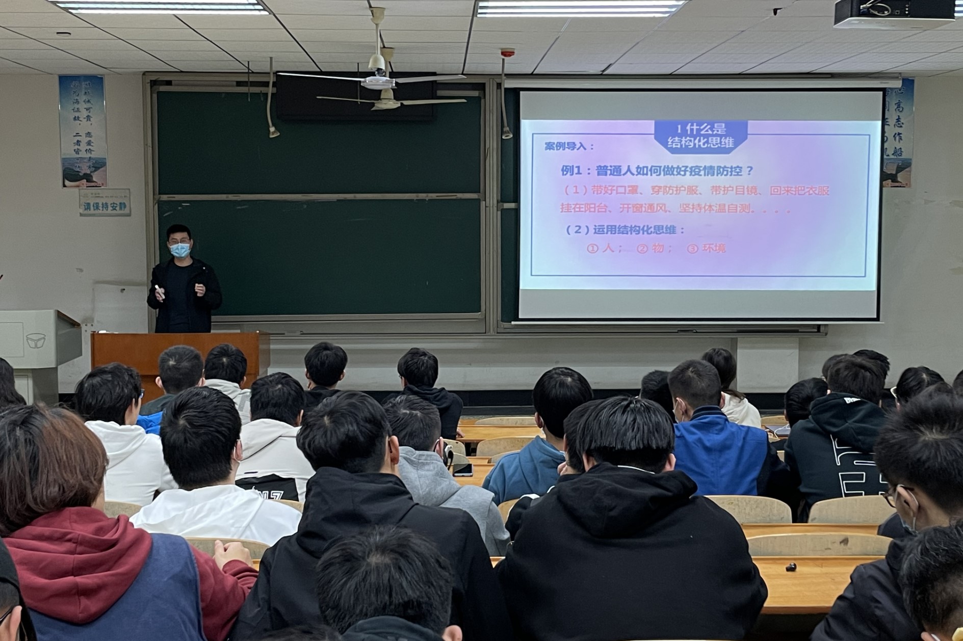 宋老師首先以“普通人如何做好疫情防控”為例,以課堂互動的方式,引導在場學生認識結構化思維,并為大家介紹了結構化思維的本質和結構化思維的作用。他講到,結構化思維其實就是讓思維從無序到有序的過程。宋老師建議大家今后在匯報工作、寫年終總結、制做簡歷、回答問題和面試等時候,都可以運用結構化思維。