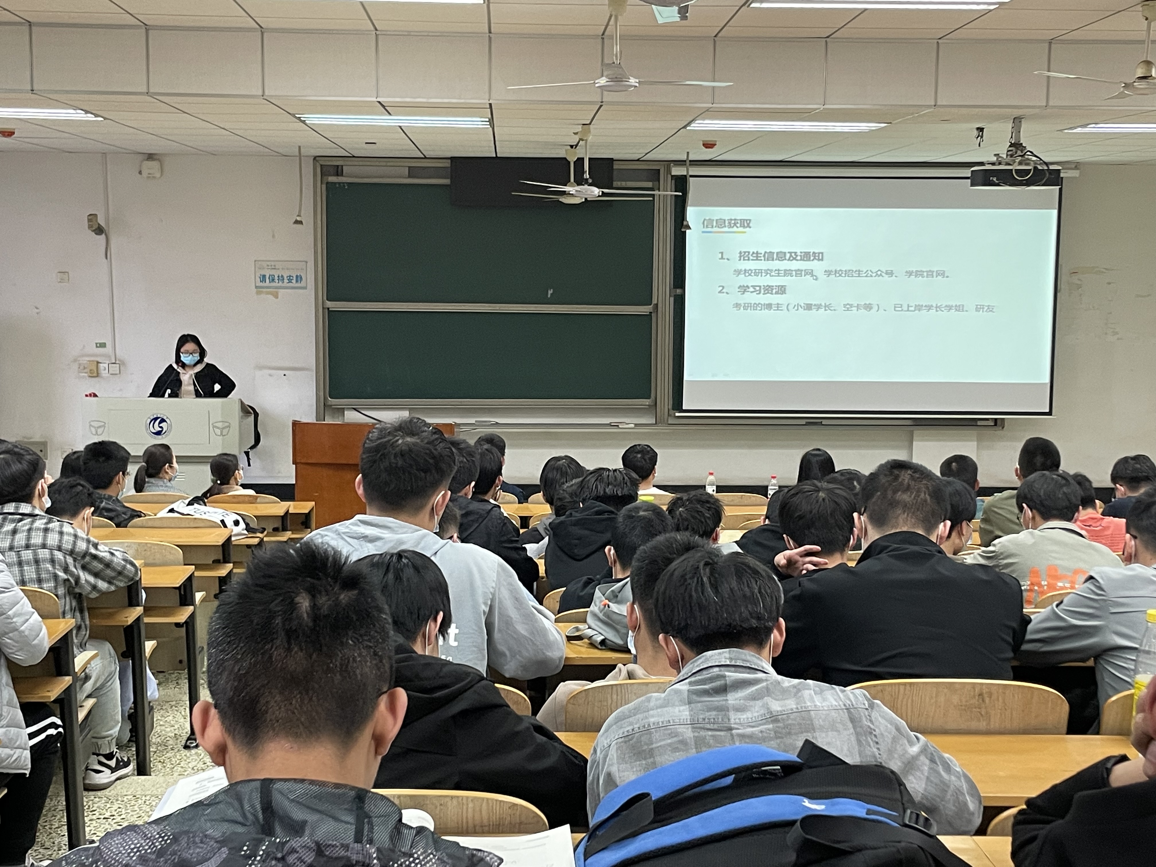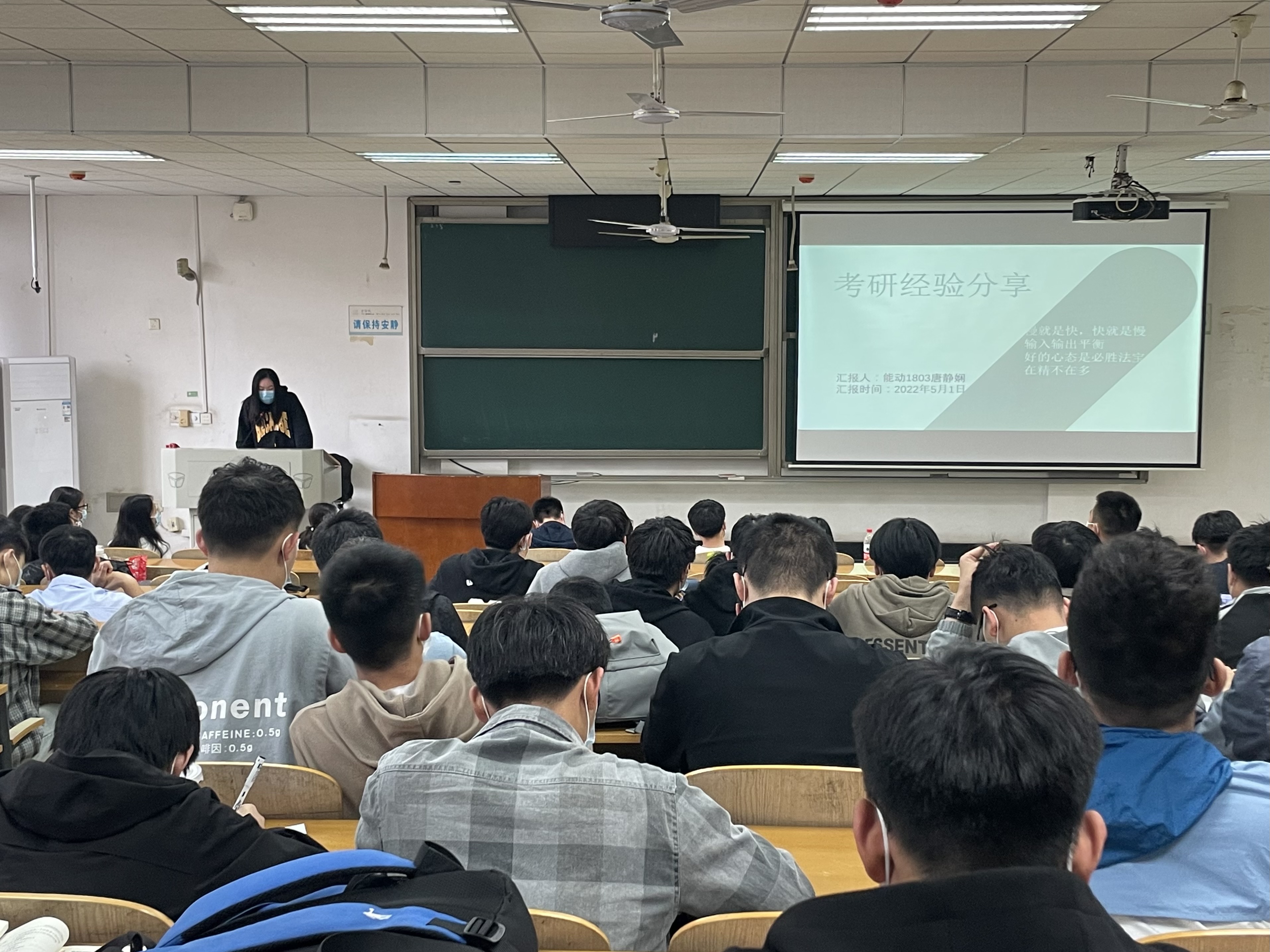 緊接著,胡佳佳同學站在保研失利后考研的立場上著重分享了她的心態調整方法。她表示我們要不斷地肯定自己,靜下心去學習,同時也需要勞逸結合,適當的緩解壓力。除此之外,她提醒在場的每位同學,每個人都需要找到適合自己的考研方法,不可以一昧盲從他人經驗。