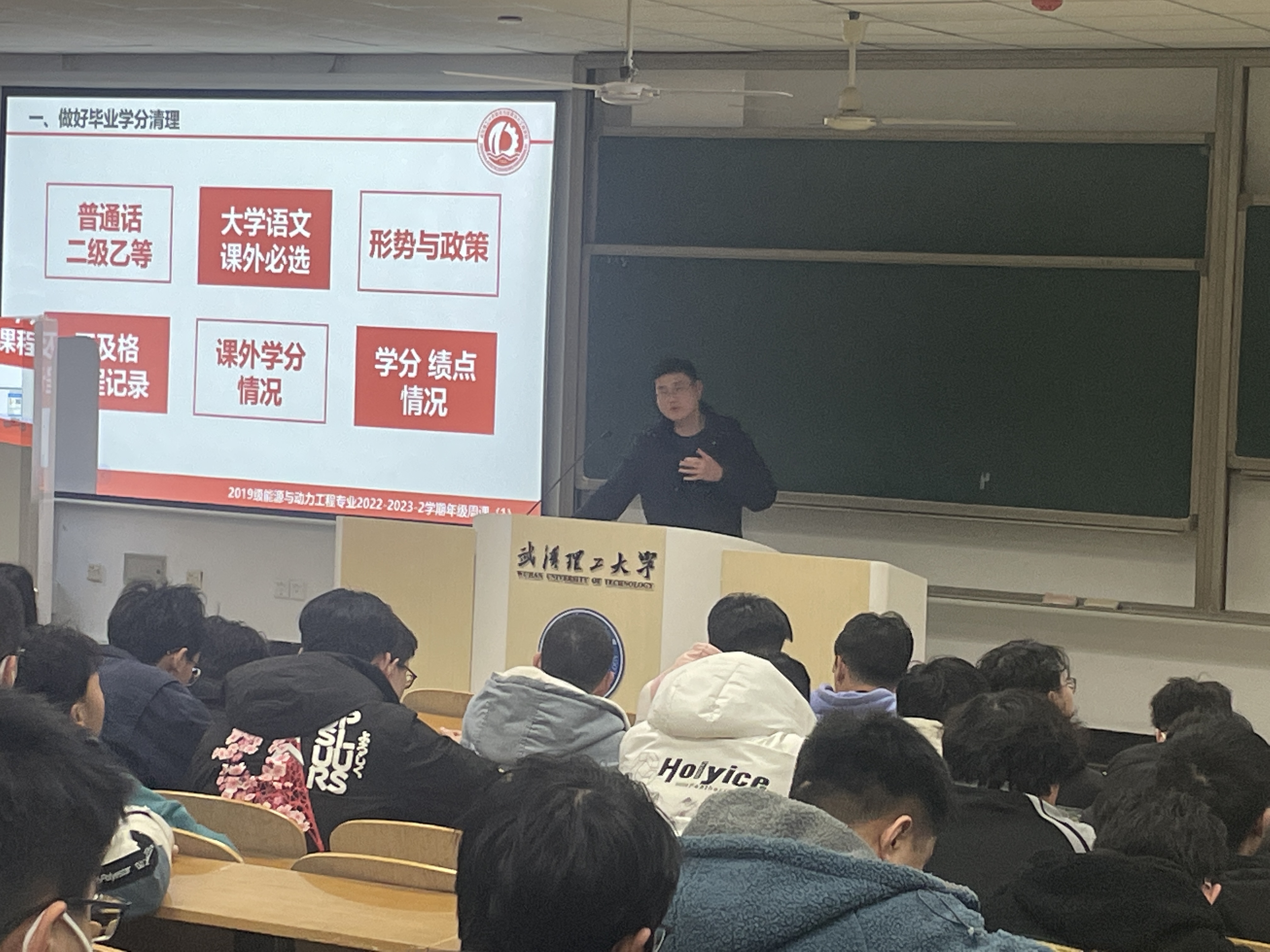 在第一次年級周課上,宋曉維老師著重強調了做好畢業學業清理的相關事宜。宋老師提醒大家,要注意對照《能源與動力工程(船舶)2017級培養方案》和《能源與動力工程(卓越工程師)2017級培養方案》,全面梳理自身的學業情況,要高度重視不及格課程情況、普通話考試、大學語文(課外必選)、課外學分修讀情況及必修課學分績點情況等目前畢業要求的各類學業情況。