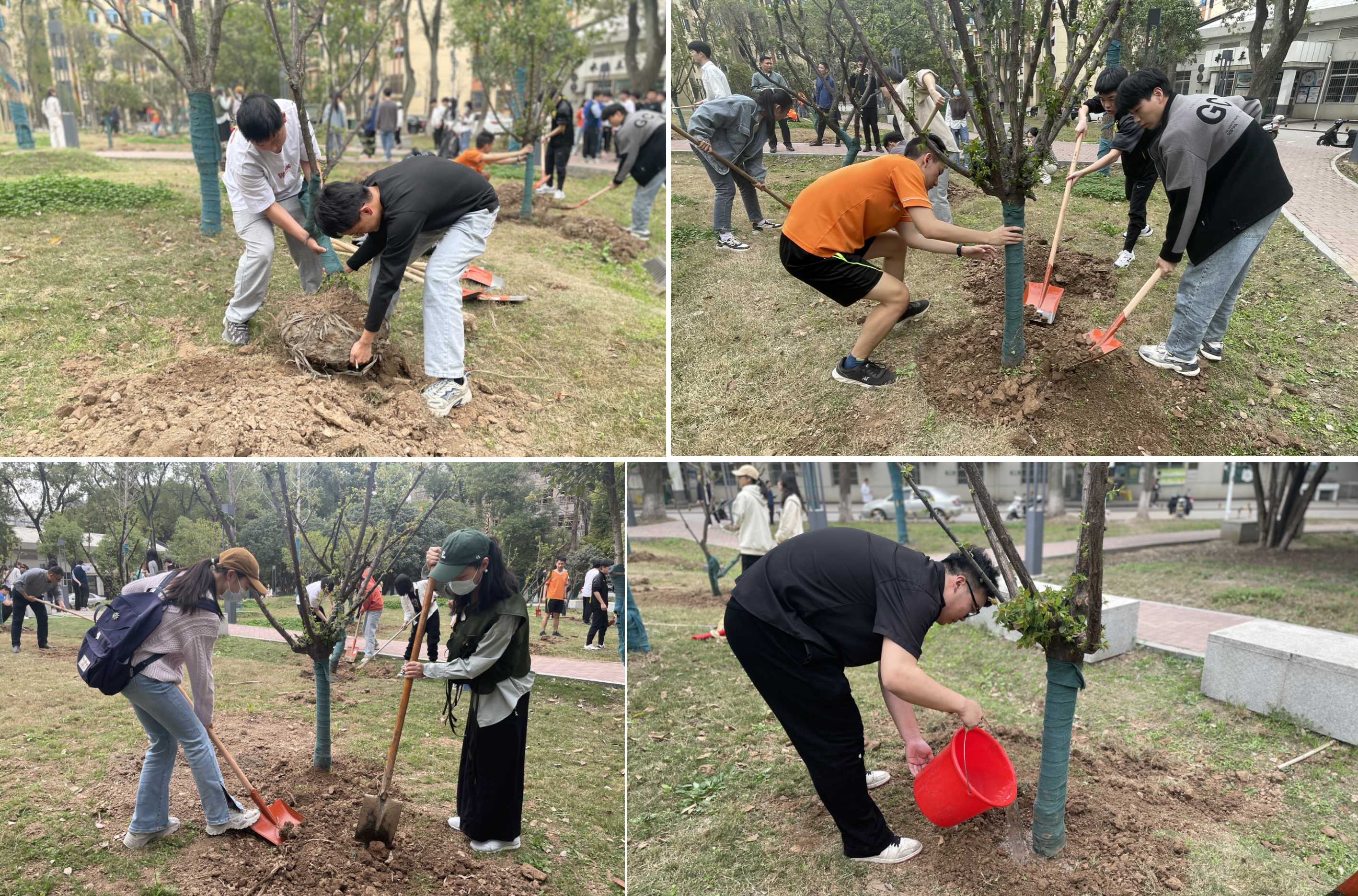 3月10日,在趙書記的帶領下,學院2023屆畢業生代表們認真扶苗、填土、緊土、澆水、植樹,掛上專屬紀念牌,用積極的行動表達了對母校的熱愛,用一棵棵新種下的樹為校園增添了一抹抹綠。